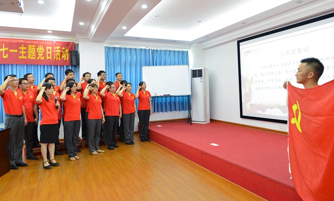全體黨員舉起右手,面對黨旗,莊嚴宣誓。鏗鏘有力的誓言響徹會場,展現(xiàn)出黨員同志們堅定的政治信念和矢志不渝的奮斗決心。