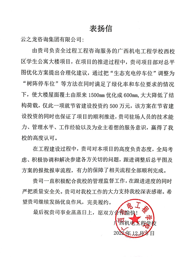 2022年12月5日,云之龍咨詢集團(tuán)再次收到來(lái)自廣西機(jī)電工程學(xué)校的表?yè)P(yáng)信。信中,該校對(duì)云之龍全過(guò)程工程咨詢團(tuán)隊(duì)的技術(shù)能力、管理水平、工作經(jīng)驗(yàn)以及為業(yè)主著想的服務(wù)意識(shí)給予高度肯定。
