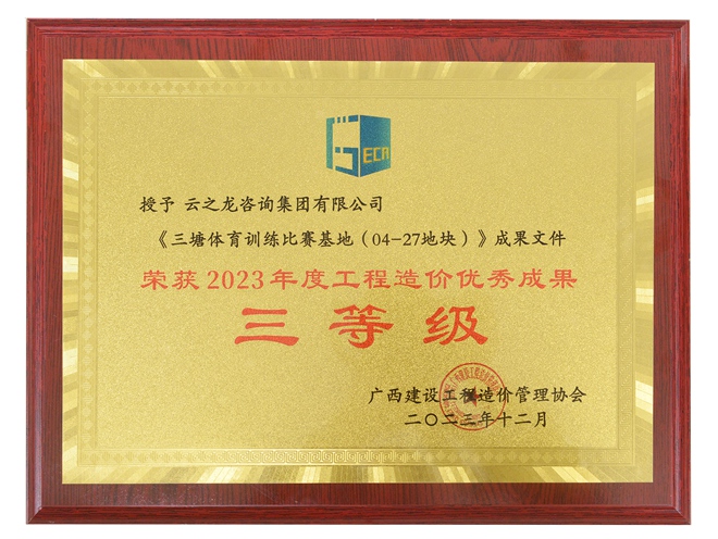 2023年12月26日,廣西建設工程造價管理協會召開了第五屆第五次理事會暨第三次會員代表大會,會議表彰了2023年度優秀工程造價成果。云之龍咨詢集團南寧市軌道交通2號線工程(玉洞~西津)合資建設項目合同-安吉車輛段與綜合基地成果文件榮獲2023年度工程造價優秀成果一等級;三塘體育訓練比賽基地(04-27地塊)項目成果文件榮獲2023年度工程造價優秀成果三等級。此外,胡冬梅獲得廣西建設工程造價管理協會優秀個人。
