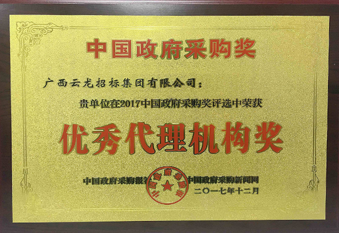 2018年1月4日-5日,2017年中國政府采購峰會在江蘇南京舉行,出席此次峰會的領導有財政部領導,中直機關采購中心,中央國家機關政府采購中心及各省、自治區、直轄市等各級財政廳(市、局)政府采購處,采購中心的代表,以及來自全國各地相關代理機構、企業家代表及專家代表等,云之龍集團總裁王鐿霖、副總裁謝志紅參加了此次峰會。在當晚的中國政府采購獎頒獎儀式上云之龍招標集團有限公司(曾用名:廣西云龍招標集團有限公司)榮獲“中國政府采購優秀代理機構”獎,這是自2012年開設此獎項以來,云之龍集團連續四年獲此殊榮,也是廣西區內唯一一家獲此獎項的單位。