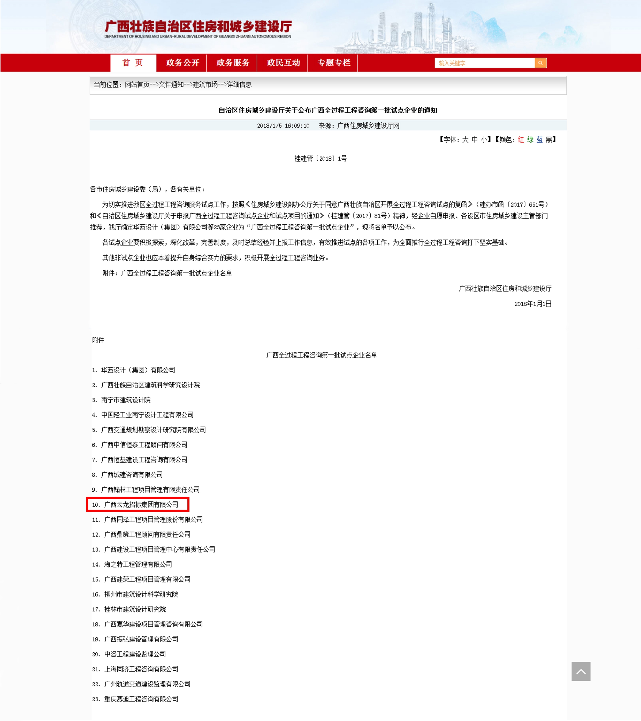 2018年1月5日,廣西壯族自治區住房和城鄉建設廳下發了《自治區住房城鄉建設廳關于公布廣西全過程工程咨詢第一批試點企業的通知》(桂建管〔2018〕1號),云之龍招標集團有限公司入選廣西全過程工程咨詢第一批試點企業。據了解,此次全區共有23家企業入選。