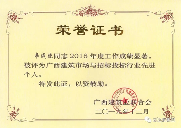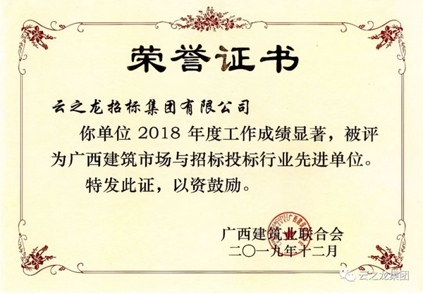 云之龍集團再次被評為“2018年度廣西建筑市場與招標投標行業先進單位”,這是集團連續第九年獲得此殊榮。此外,集團項目經理韋成曉獲得“先進個人”稱號。